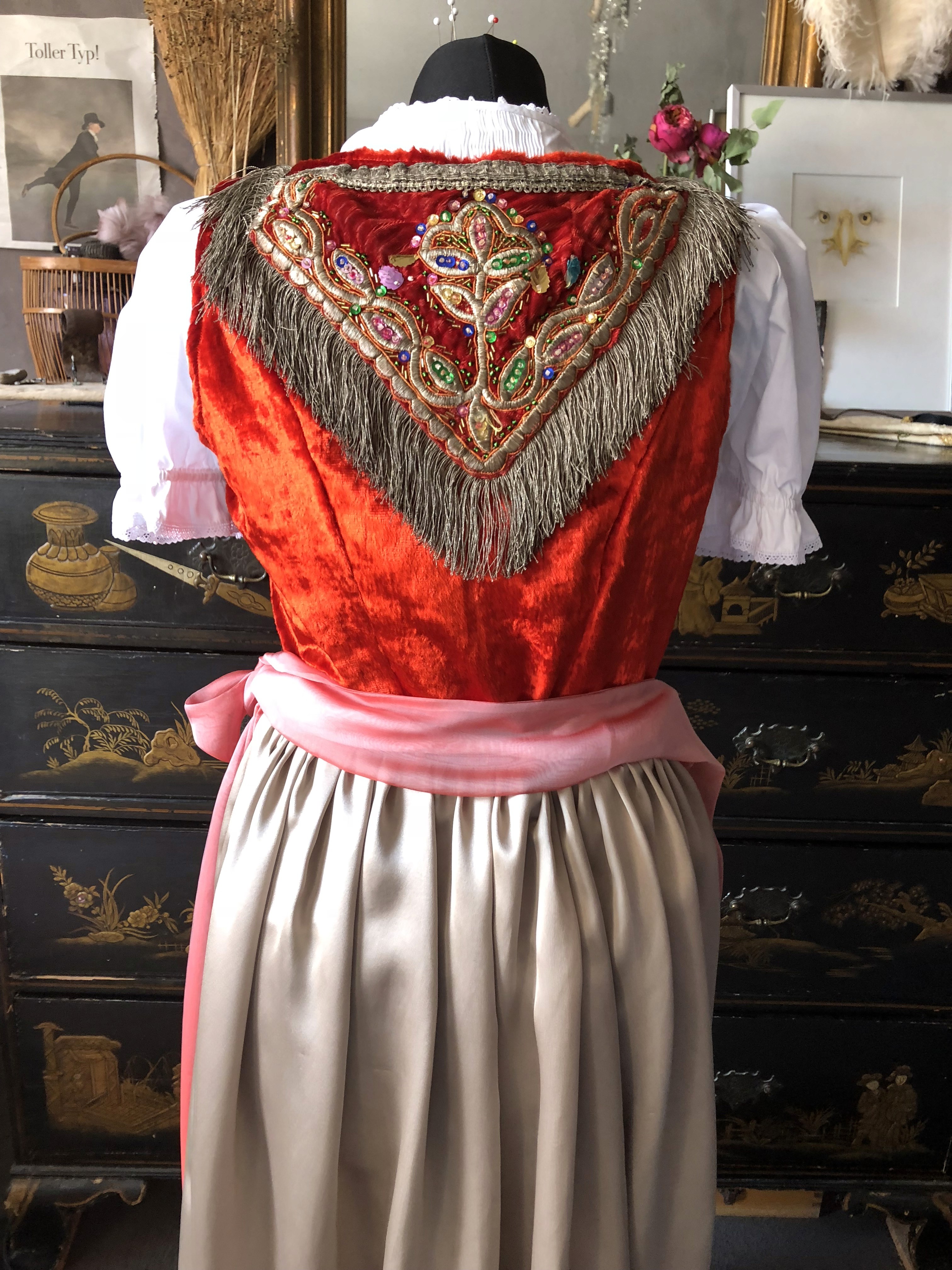 Dieses Dirndl ist ein Stück aus Samt und Seide. Das Mieder ist aus Seidensamt, der vor vielen Jahren in Syrien gekauft wurde. Die Stickerei, die am Nacken und vorne aufgenäht wurde, war Teil einer antiken Weste aus Jordanien. Rund um den Ausschnitt habe ich eine alte Fransenborte aus Silberfäden angelegt. Der Rock ist aus einem Duchesse-Satin, dem edelsten Seidensatin, den ich finden konnte, gemacht. Und die Schürze ist feiner Seidenchiffon. Zweifarbig gewebt. Ein Prachtstück !